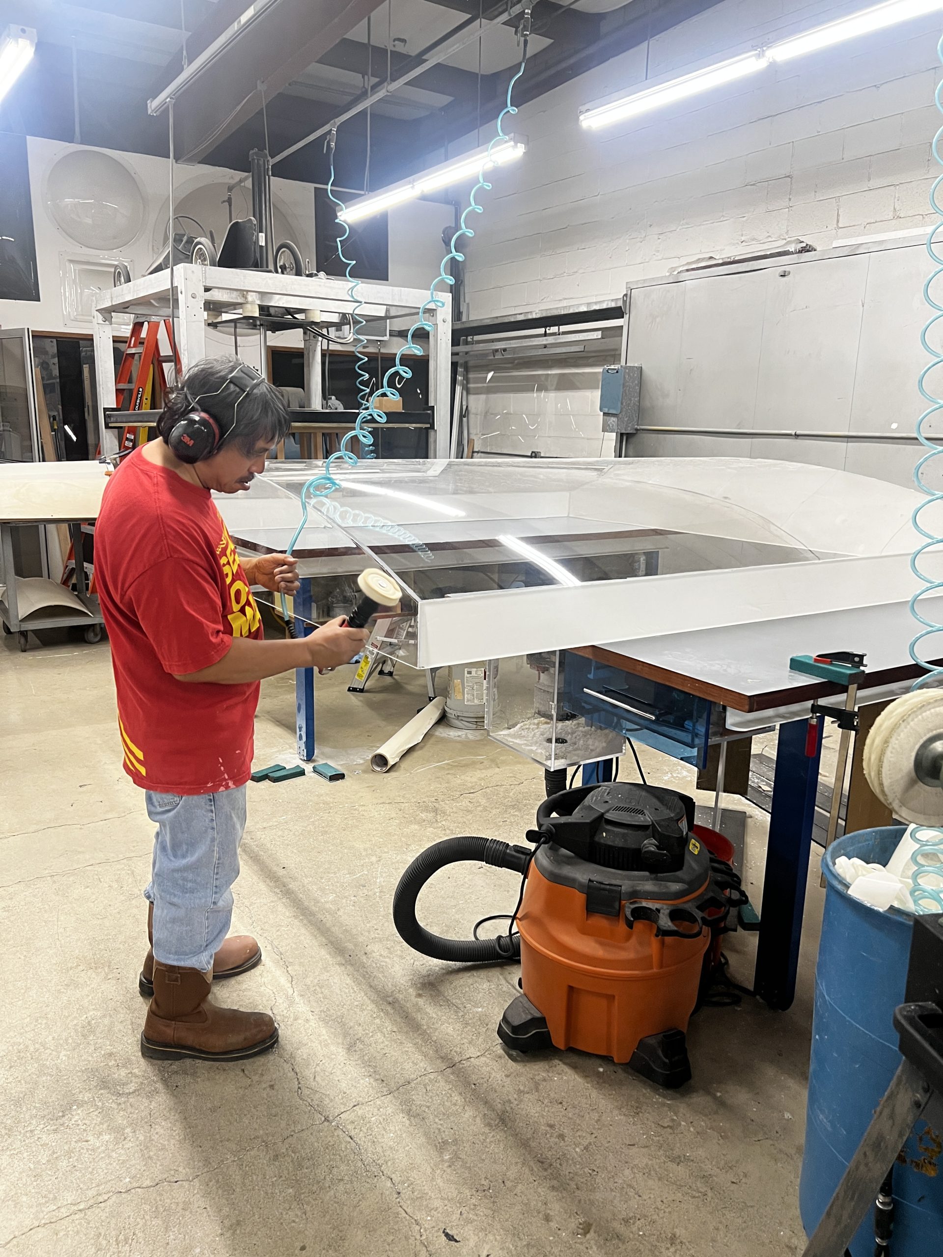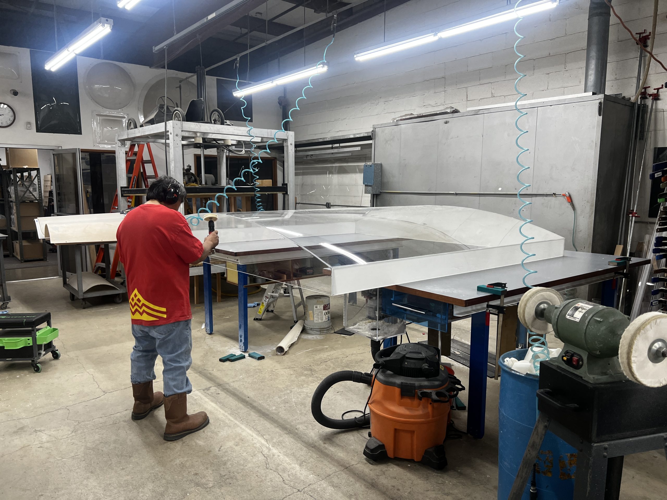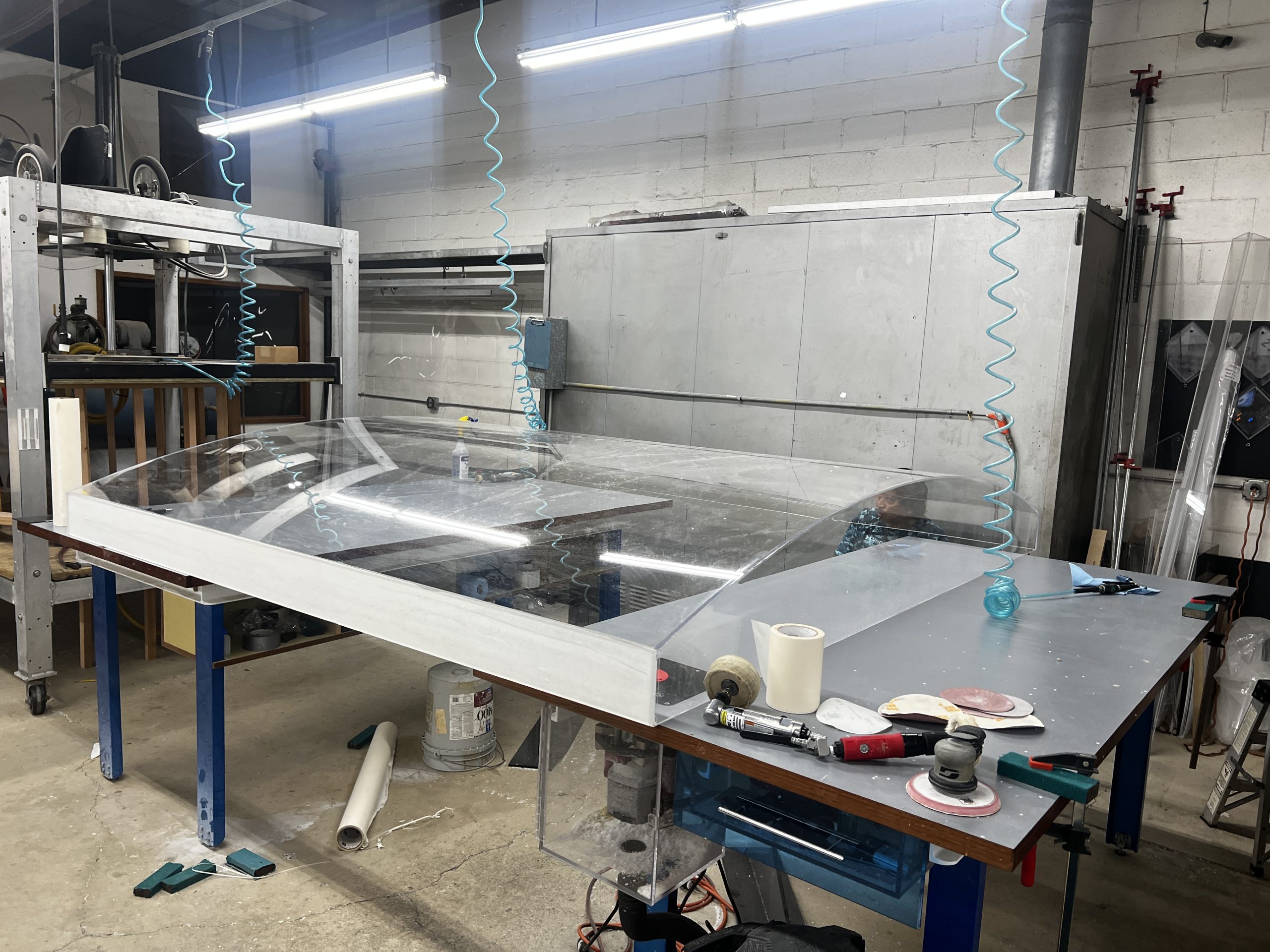 This gallery documents the fabrication and assembly process for the oversized acrylic display case, including cementing, forming, polishing, and final assembly. Extra-large acrylic sheets were special ordered to meet the project’s size requirements, then cut, bonded, and finished in-house to achieve structural integrity and optical clarity.